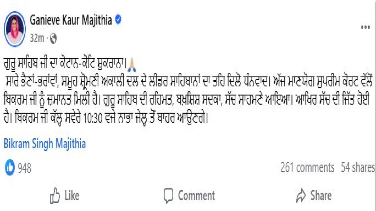ਬਿਕਰਮ ਸਿੰਘ ਮਜੀਠੀਆ ਦੀ ਧਰਮਪਤਨੀ ਤੇ ਮਜੀਠਾ ਤੋਂ ਵਿਧਾਇਕਾ ਗਿਨੀਵ ਕੌਰ ਮਜੀਠਾ ਨੇ ਟਵੀਟ ਰਾਹੀਂ ਜਾਣਕਾਰੀ ਦਿੰਦਿਆਂ ਦੱਸਿਆ ਹੈ ਕਿ ਅਕਾਲੀ ਆਗੂ 10:30 ਵਜੇ ਦੇ ਲਗਭਗ ਜੇਲ੍ਹ ਵਿਚੋਂ ਬਾਹਰ ਹਨ। ਅਕਾਲੀ ਦਲ ਦੇ ਸੀਨੀਅਰ ਆਗੂ ਨੂੰ ਸੁਪਰੀਮ ਕੋਰਟ ਤੋਂ ਬੀਤੇ ਦਿਨ ਆਮਦਨ ਤੋਂ ਵੱਧ ਜਾਇਦਾਦ ਮਾਮਲੇ ਵਿੱਚ ਜ਼ਮਾਨਤ ਮਿਲੀ ਸੀ, ਜਿਸ ਤੋਂ ਬਾਅਦ ਉਨ੍ਹਾਂ ਦੀ ਰਿਹਾਈ ਨੂੰ ਲੈ ਕੇ ਨਾਭਾ ਜੇਲ੍ਹ ਦੇ ਬਾਹਰ ਵੱਡੀ ਗਿਣਤੀ ਵਿੱਚ ਆਗੂ ਤੇ ਵਰਕਰ ਸਵਾਗਤ ਲਈ ਦੇਰ ਰਾਤ ਤੋਂ ਪਹੁੰਚੇ ਹੋਏ ਹਨ ਅਤੇ ਆਤਿਸ਼ਬਾਜ਼ੀ ਵੀ ਕੀਤੀ ਗਈ।