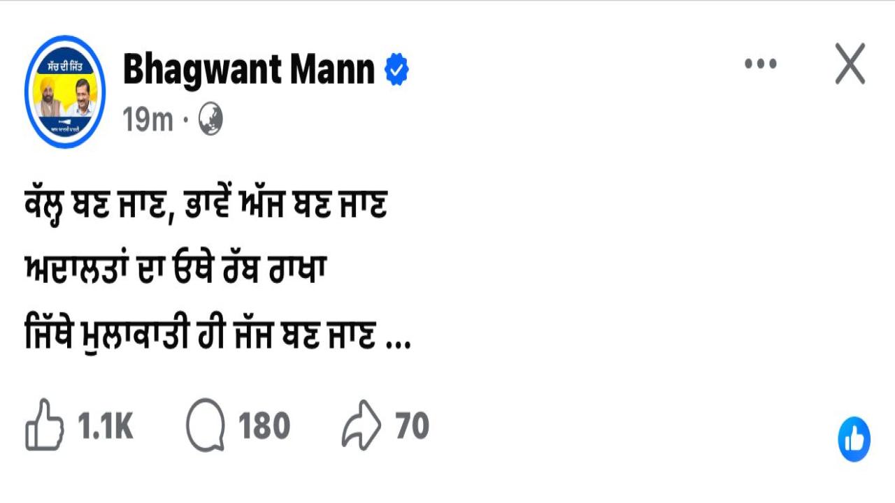 ਮੁੱਖ ਮੰਤਰੀ ਭਗਵੰਤ ਮਾਨ ਨੇ ਬਿਕਰਮ ਸਿੰਘ ਮਜੀਠੀਆ ਦੀ ਰਿਹਾਈ 'ਤੇ ਤੰਜ ਕੱਸਿਆ ਹੈ। ਮੁੱਖ ਮੰਤਰੀ ਨੇ ਲਿਖਿਆ, "ਕੱਲ ਬਣ ਜਾਵੇ, ਭਾਵੇਂ ਅੱਜ ਬਣ ਜਾਣ। ਅਦਾਲਤਾਂ ਦਾ ਓਥੇ ਰੱਬ ਹੀ ਰਾਖਾ। ਜਿਥੇ ਮੁਲਾਕਾਤੀ ਹੀ ਜੱਜ ਬਣ ਜਾਣ।"