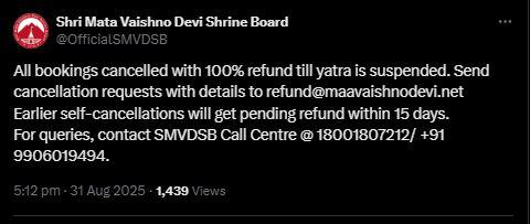 ਸ਼ਰਾਈਨ ਬੋਰਡ (SMVDSB) ਨੇ ਸੋਸ਼ਲ ਮੀਡੀਆ 'ਤੇ ਜਾਣਕਾਰੀ ਦਿੱਤੀ ਕਿ ਜੋ ਲੋਕ ਆਪਣੀ ਬੁਕਿੰਗ ਰੱਦ ਕਰਨਾ ਚਾਹੁੰਦੇ ਹਨ, ਉਹ ਈਮੇਲ ਰਾਹੀਂ ਆਪਣੀ ਰੱਦ ਕਰਨ ਦੀ ਜਾਣਕਾਰੀ ਭੇਜ ਸਕਦੇ ਹਨ। ਬੋਰਡ ਵੱਲੋਂ ਕਿਹਾ ਗਿਆ ਹੈ ਕਿ ਜਿੰਨਾ ਚਿਰ ਯਾਤਰਾ ਰੁਕੀ ਹੋਈ ਹੈ, ਸਾਰੀਆਂ ਬੁਕਿੰਗਾਂ ਰੱਦ ਕਰਨ 'ਤੇ 100% ਰਿਫੰਡ ਕੀਤੀਆਂ ਜਾਣਗੀਆਂ।