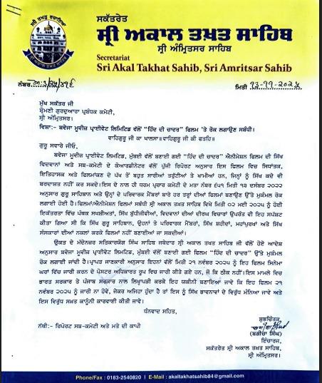 ਇਸ ਮਾਮਲੇ ਵਿਚ ਭਾਰਤ ਸਰਕਾਰ ਤੇ ਪੰਜਾਬ ਸਰਕਾਰ ਨਾਲ ਲਿਖਤੀ ਪੱਤਰ ਲਿਖ ਕੇ ਇਹ ਯਕੀਨੀ ਬਣਾਇਆ ਜਾਵੇ ਕਿ ਇਹ ਫਿਲਮ 21 ਨਵੰਬਰ 2025 ਨੂੰ ਰਿਲੀਜ਼ ਨਾ ਹੋਵੇ, ਜੇਕਰ ਅਜਿਹਾ ਹੁੰਦਾ ਹੈ ਤਾਂ ਇਸ ਨੂੰ ਸਿੱਖ ਭਾਵਨਾਵਾਂ ਦੇ ਵਿਰੁੱਧ ਮੰਨਿਆ ਜਾਵੇ ਅਤੇ ਇਸ ਵਿਰੁੱਧ ਸਖ਼ਤ ਕਾਨੂੰਨੀ ਕਾਰਵਾਈ ਕੀਤੀ ਜਾਵੇ।
