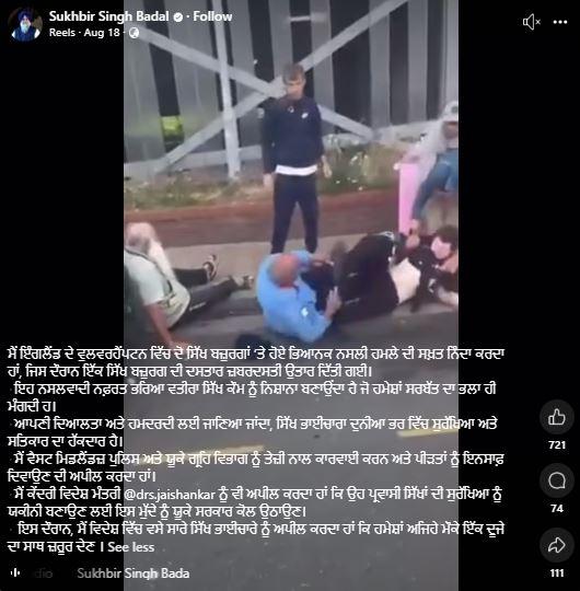 ਸੁਖਬੀਰ ਸਿੰਘ ਬਾਦਲ ਨੇ ਭਾਰਤੀ ਵਿਦੇਸ਼ ਮੰਤਰੀ ਡਾ. ਐਸ. ਜੈਸ਼ੰਕਰ ਨੂੰ ਅਪੀਲ ਕੀਤੀ ਕਿ ਉਹ ਸਿੱਖ ਪ੍ਰਵਾਸੀਆਂ ਦੀ ਸੁਰੱਖਿਆ ਨੂੰ ਯਕੀਨੀ ਬਣਾਉਣ ਲਈ ਯੂਕੇ ਸਰਕਾਰ ਕੋਲ ਇਹ ਮੁੱਦਾ ਉਠਾਉਣ।
