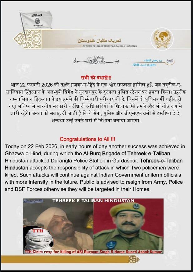 Gurdaspur Police : ਗੁਰਦਾਸਪੁਰ ਦੇ ਪਿੰਡ ਅਡੀਆਂ 'ਚ ਦੋ ਪੁਲਿਸ ਮੁਲਾਜ਼ਮਾਂ ਦੀ ਮੌਤ (Punjab Police) ਦੇ ਮਾਮਲੇ ਵਿੱਚ ਵੱਡੀ ਅਪਡੇਟ ਸਾਹਮਣੇ ਆਈ ਹੈ। ਮਾਮਲੇ ਵਿੱਚ ਜਥੇਬੰਦੀ ਤਹਿਰੀਕ-ਏ-ਤਾਲਿਬਾਨ ਹਿੰਦੋਸਤਾਨ ਨੇ ਜ਼ਿੰਮੇਵਾਰੀ ਲੈਂਦਿਆਂ ਦੋਵਾਂ ਪੁਲਿਸ ਮੁਲਾਜ਼ਮਾਂ ਨੂੰ ਕਤਲ ਕੀਤੇ ਜਾਣ ਦੀ ਗੱਲ ਕਹੀ ਹੈ। ਜਥੇਬੰਦੀ ਵੱਲੋਂ ਇਸ ਸਬੰਧੀ ਇੱਕ ਕਥਿਤ ਪੋਸਟ ਸਾਂਝੀ ਕਰਕੇ ਜ਼ਿੰਮੇਵਾਰੀ ਲਈ ਗਈ ਹੈ। (PTC News, ਪੋਸਟ ਦੇ ਪੁਖਤਾ ਹੋਣ ਦੀ ਜ਼ਿੰਮੇਵਾਰੀ ਨਹੀਂ ਲੈਂਦਾ।)