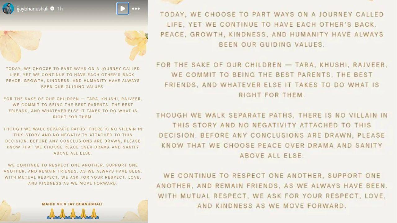 Jay Bhanushali Mahi Vij Divorce : ਟੀਵੀ ਅਦਾਕਾਰਾਂ ਮਾਹੀ ਵਿਜ ਅਤੇ ਜੈ ਭਾਨੂੰਸ਼ਾਲੀ ਨੇ ਆਪਣੇ ਵੱਖ ਹੋਣ ਦੀ ਖ਼ਬਰ ਪ੍ਰਸ਼ੰਸਕਾਂ ਨਾਲ ਸਾਂਝੀ ਕੀਤੀ ਹੈ। ਪਿਛਲੇ ਕੁਝ ਦਿਨਾਂ ਤੋਂ, ਅਫਵਾਹਾਂ ਸਨ ਕਿ ਇਹ ਜੋੜਾ ਤਲਾਕ ਲੈਣ ਵਾਲਾ ਹੈ। ਜਿੱਥੇ ਮਾਹੀ ਵਿਜ ਅਤੇ ਜੈ ਭਾਨੂੰਸ਼ਾਲੀ, ਇਸ ਮਾਮਲੇ 'ਤੇ ਚੁੱਪ ਰਹੇ ਹਨ, ਉੱਥੇ ਹੀ ਉਨ੍ਹਾਂ ਨੇ ਹੁਣ ਇੰਸਟਾਗ੍ਰਾਮ 'ਤੇ ਇੱਕ ਪੋਸਟ ਸਾਂਝੀ ਕਰਕੇ ਪ੍ਰਸ਼ੰਸਕਾਂ ਨੂੰ ਇਸ ਖ਼ਬਰ ਦੀ ਪੁਸ਼ਟੀ ਕੀਤੀ ਹੈ। ਉਨ੍ਹਾਂ ਨੇ ਇਹ ਵੀ ਖੁਲਾਸਾ ਕੀਤਾ ਕਿ ਉਹ 14 ਸਾਲ ਦੇ ਵਿਆਹ ਤੋਂ ਬਾਅਦ ਵੱਖ ਹੋ ਰਹੇ ਹਨ। ਇਸ ਖ਼ਬਰ ਨੇ ਪ੍ਰਸ਼ੰਸਕਾਂ ਨੂੰ ਹੈਰਾਨ ਕਰ ਦਿੱਤਾ ਹੈ।