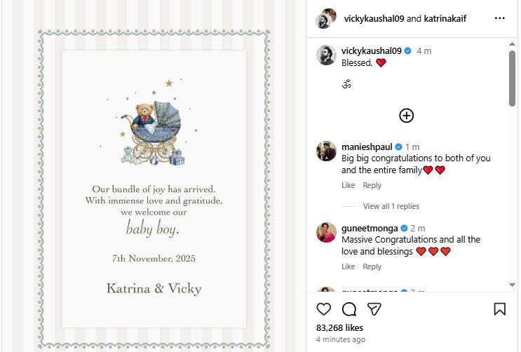 ਵਿੱਕੀ ਕੌਸ਼ਲ ਨੇ ਆਪਣੇ ਪ੍ਰਸ਼ੰਸਕਾਂ ਨਾਲ ਖੁਸ਼ਖਬਰੀ ਸਾਂਝੀ ਕਰਦੇ ਹੋਏ ਲਿਖਿਆ, "ਸਾਡਾ ਖੁਸ਼ੀਆਂ ਦਾ ਖਿਡੌਣਾ ਆ ਗਿਆ ਹੈ। ਅਸੀਂ ਦੋਵੇਂ ਬਹੁਤ ਖੁਸ਼ ਹਾਂ, ਕਿਉਂਕਿ ਇਹ ਸਾਡੀ ਖੁਸ਼ੀ ਹੈ, ਅਤੇ ਅਸੀਂ ਰੱਬ ਦਾ ਧੰਨਵਾਦ ਕਰਦੇ ਹਾਂ ਕਿ ਸਾਨੂੰ ਪੁੱਤਰ ਦਿੱਤਾ। 7 ਨਵੰਬਰ, 2025, ਕੈਟਰੀਨਾ ਅਤੇ ਵਿੱਕੀ।"