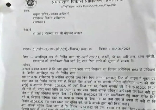 प्रयागराज हिंसा के मास्टरमाइंड कहे जा रहे जावेद अहमद पंप के खिलाफ प्रयागराज विकास प्राधिकरण से बिना नक्शा पास कराए मकान बनवाने का आरोप लगा है। इस मामले में अब प्रशासन की कार्रवाई होने वाली है। पीडीए की ओर से इस संबंध में उसके घर पर नोटिस चिपका दिया गया है। नोटिस में कहा गया है।