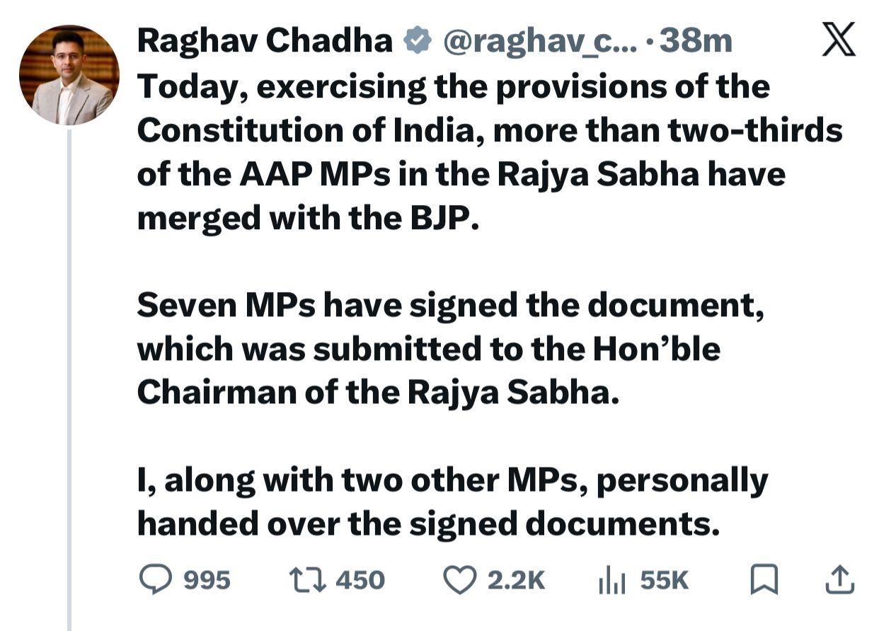 Raghav Chadha also announced that the group has initiated formal proceedings to merge with the BJP and has submitted the necessary documentation to the Rajya Sabha Secretariat.