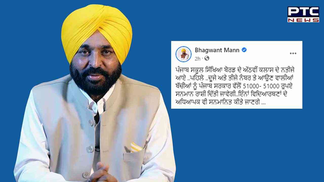 Punjab Chief Minister Bhagwant Mann took to his official Twitter handle to congratulate the PSEB toppers and announced cash reward to Rs 51,000 to all the three toppers.