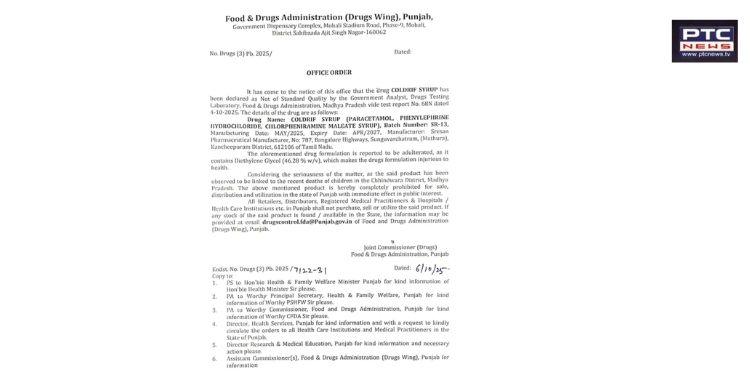 The Punjab Government stated that since the syrup has been linked to multiple child deaths in Madhya Pradesh’s Chhindwara district, its sale, distribution, and use are now strictly prohibited in the state.