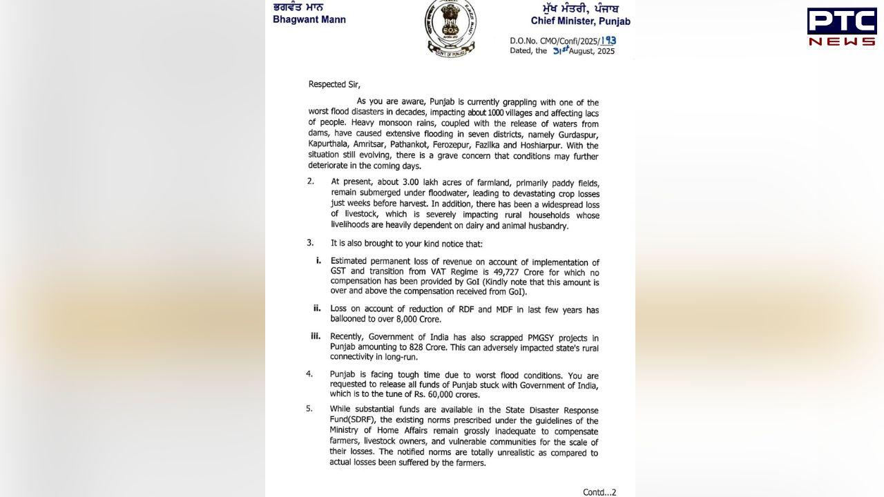 CM Bhagwant Mann writes to Prime Minister Narendra Modi. The letter said, "You are requested to release all funds of Punjab stuck with Government of India, which is to the tune of Rs 60,000 crores."
