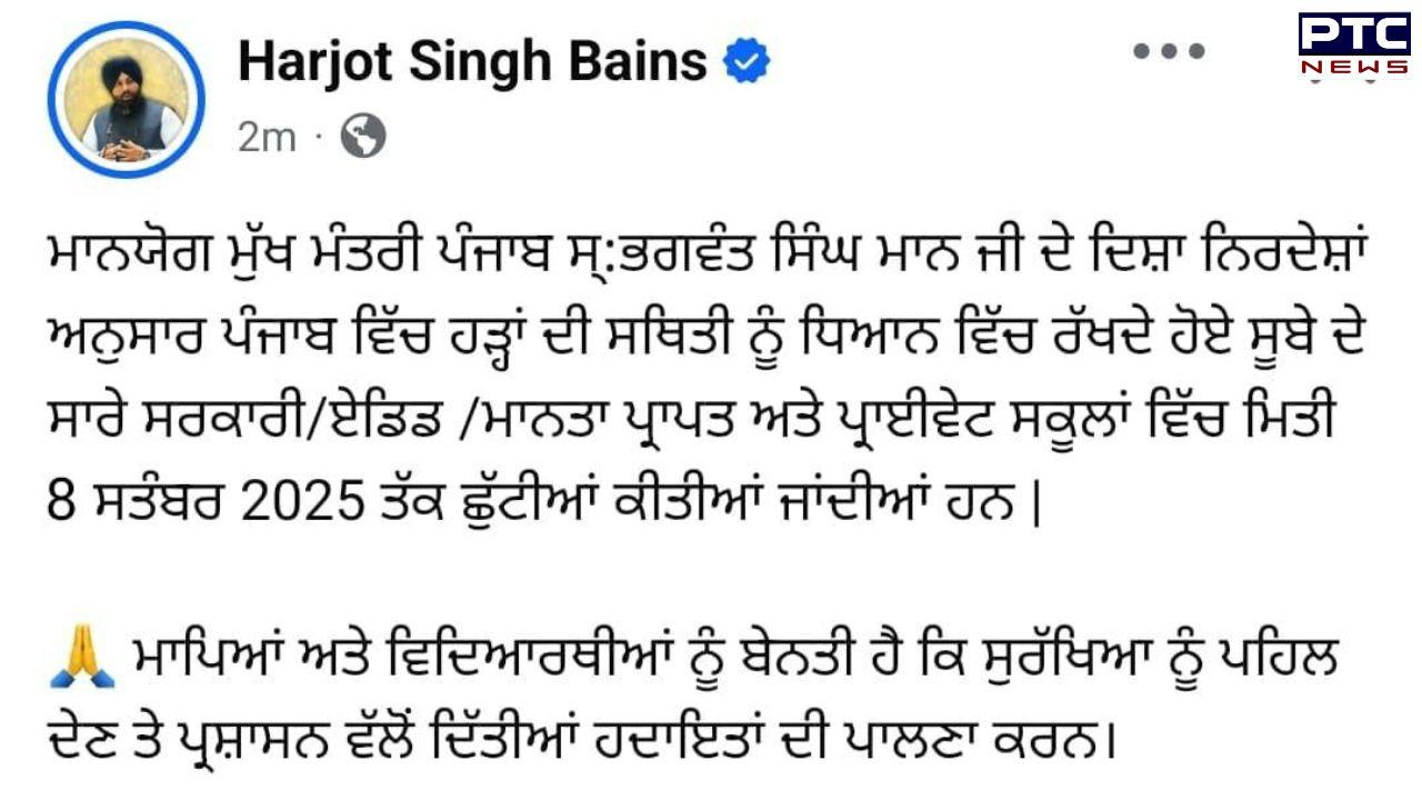 dir="ltr">ਮਾਨਯੋਗ ਮੁੱਖ ਮੰਤਰੀ ਪੰਜਾਬ ਸ੍:ਭਗਵੰਤ ਸਿੰਘ ਮਾਨ ਜੀ ਦੇ ਦਿਸ਼ਾ ਨਿਰਦੇਸ਼ਾਂ ਅਨੁਸਾਰ ਪੰਜਾਬ ਵਿੱਚ ਹੜ੍ਹਾਂ ਦੀ ਸਥਿਤੀ ਨੂੰ ਧਿਆਨ ਵਿੱਚ ਰੱਖਦੇ ਹੋਏ ਸੂਬੇ ਦੇ ਸਾਰੇ ਸਰਕਾਰੀ/ਏਡਿਡ /ਮਾਨਤਾ ਪ੍ਰਾਪਤ ਅਤੇ ਪ੍ਰਾਈਵੇਟ ਸਕੂਲਾਂ ਵਿੱਚ ਮਿਤੀ 3 ਸਤੰਬਰ 2025 ਤੱਕ ਛੁੱਟੀਆਂ ਕੀਤੀਆਂ ਜਾਂਦੀਆਂ ਹਨ |<br><br>???? ਮਾਪਿਆਂ ਅਤੇ ਵਿਦਿਆਰਥੀਆਂ ਨੂੰ ਬੇਨਤੀ ਹੈ ਕਿ…p>— Harjot Singh Bains (@harjotbains) August 31, 2025