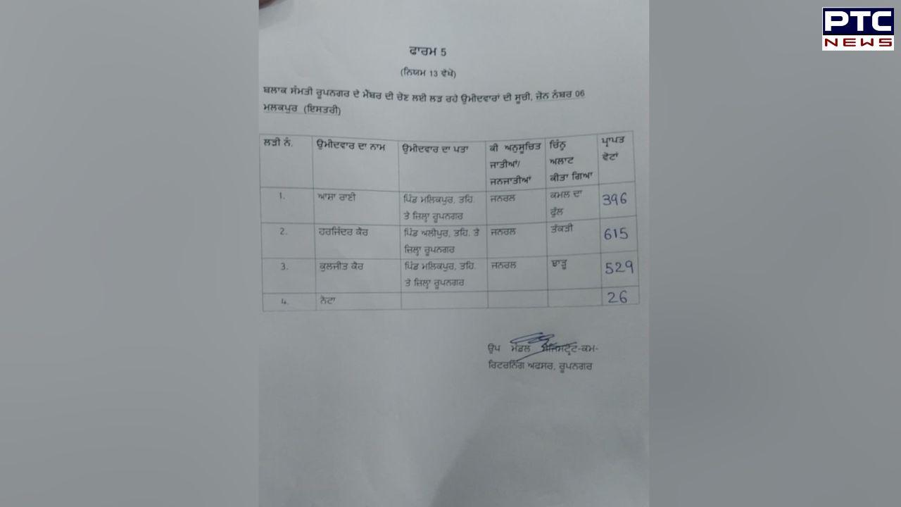 Out of the 15 seats in the Ropar block, the Aam Aadmi Party won 7 seats, the Congress secured victory in 6 seats, while the Shiromani Akali Dal won 2 seats.
