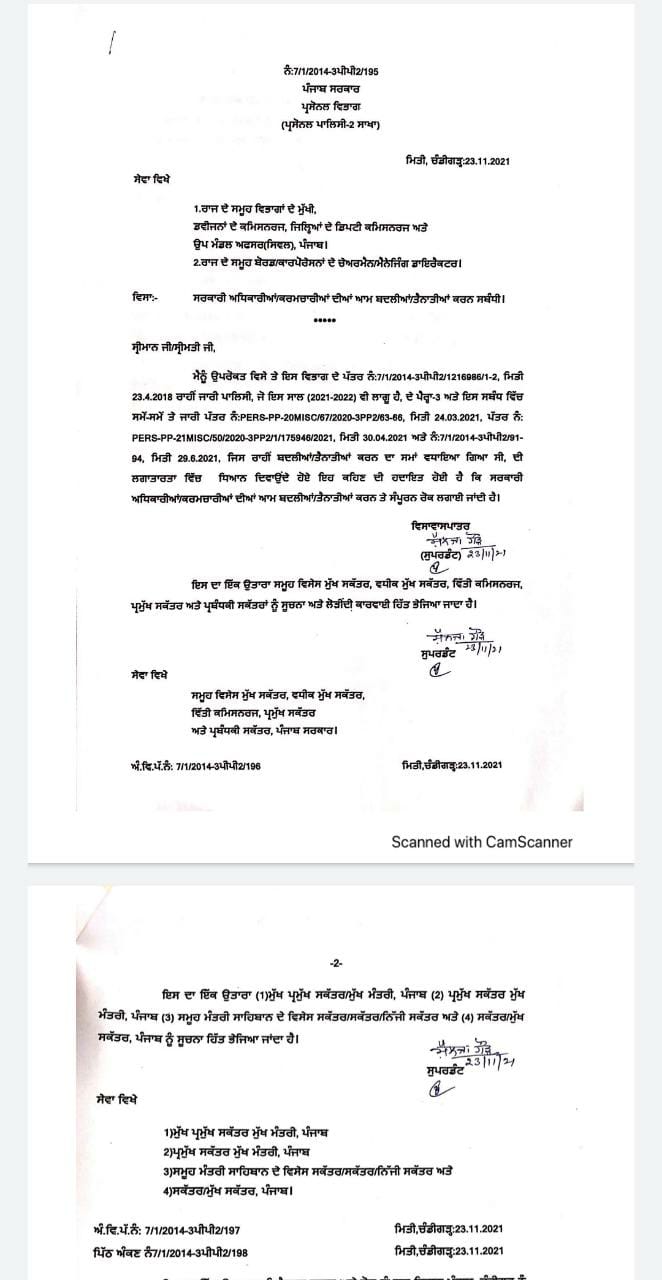 ਚੰਡੀਗੜ੍ਹ : ਪੰਜਾਬ ਸਰਕਾਰ ਵੱਲੋਂ ਮੁਲਾਜ਼ਮਾਂ ਦੀਆਂ ਬਦਲੀਆਂ 'ਤੇ ਮੁਕੰਮਲ ਪਾਬੰਦੀ ਲੈ ਦਿੱਤੀ ਗਈ ਹੈ।