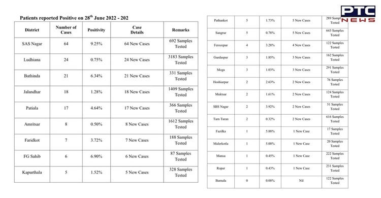 In Bathinda, 21 persons tested positive with positivity rate of 6.34%. Jalandhar reported 18 new cases with a positivity rate of 1.28%. In Patiala, 17 persons tested Covid positive.