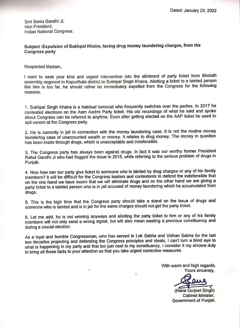 In a letter written to Sonia Gandhi, Rana Gurjeet Singh wrote: "I want to seek your kind and urgent intervention into the allotment of party ticket from Bholath assembly segment in Kapurthala district to Sukhpal Singh Khaira. Allotting a ticket to a tainted person like him is too far, he should rather be immediately expelled from Congress for the following reasons."
