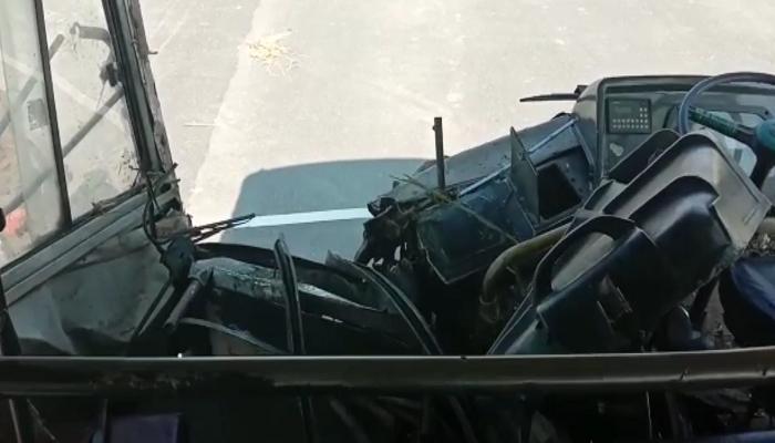 यमुनानगर। (तिलक भारद्वाज) यमुनानगर के नेशनल हाईवे स्थित बस चालक की लापरवाही के चलते बस सड़क किनारे जा रहे गन्ने से भरे ट्रैक्टर ट्राली से जा टकराई। हालांकि यह बड़ा हादसा होते होते बच गया। क्योंकि बस ने ट्रैक्टर ट्राली को पीछे से टक्कर मारी थी। अगर यह आमने-सामने टक्कर होती तो बड़ा हादसा हो सकता था। इस हादसे में आधा दर्जन लोगों को चोटें आई हैं जिसमें दो को उपचार के लिए ट्रामा सेंटर दाखिल करवाया गया है।