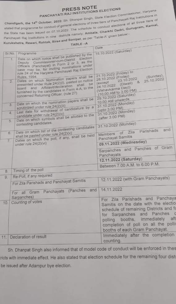 पहले चरण के लिए 14 से 19 अक्तूबर तक नॉमिनेशन भरे जाएंगे। 20 अक्तूबर को नॉमिनेशन की छंटनी होगी और 21 अक्तूबर तक नॉमिनेशन वापस लिए जा सकेंगे।सरपंच-पंचों के लिए वोटिंग 2 नवंबर को होगी। सरपंच-पंचों की मतगणना मतदान के दिन होगी। जिला परिषद और पंचायत समितियों की मतगणना राज्य के बाकी जिलों में चुनाव खत्म होने के बाद एक साथ कराई जाएगी।