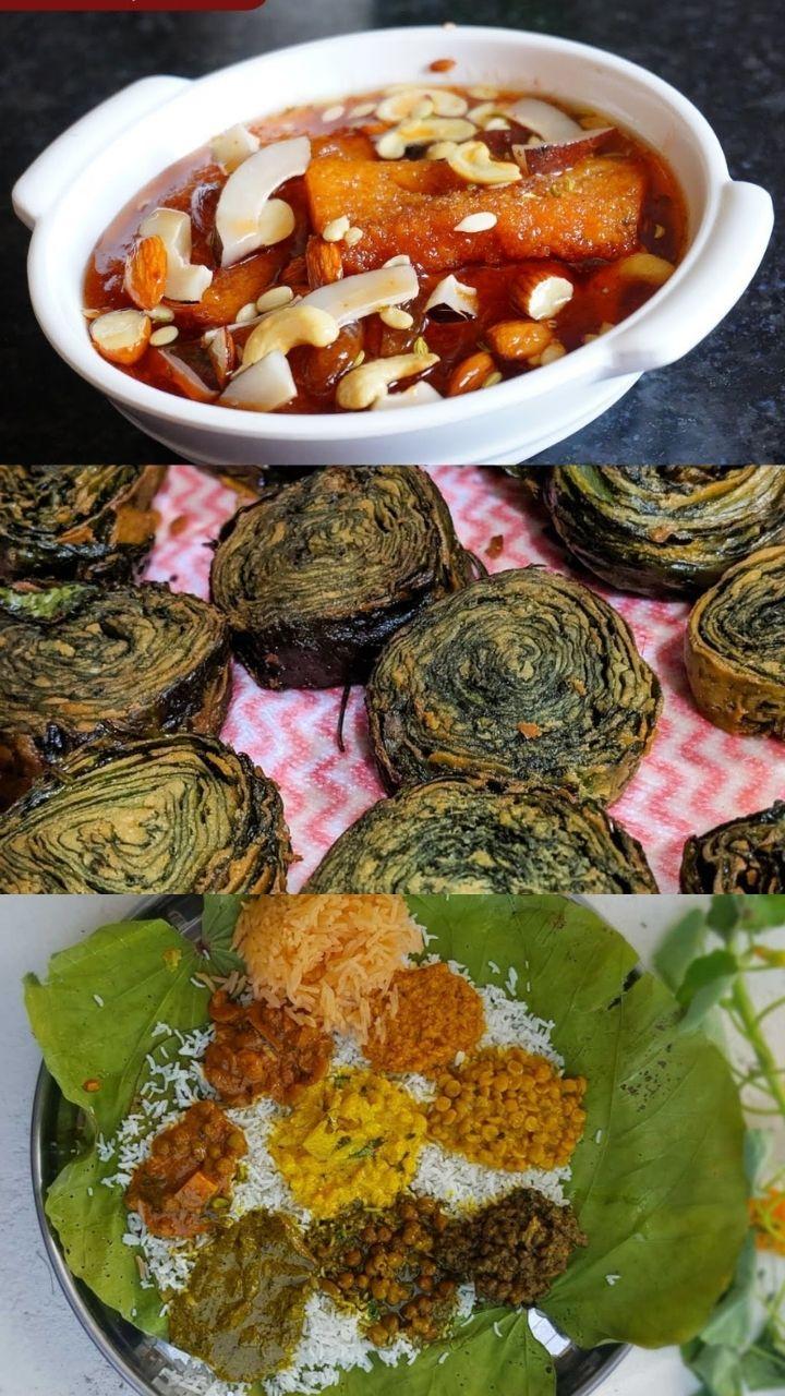 Colocasia leaves coated with a thick gram flour paste, rolled up, steamed, and then fried. It’s crispy on the outside and soft inside.