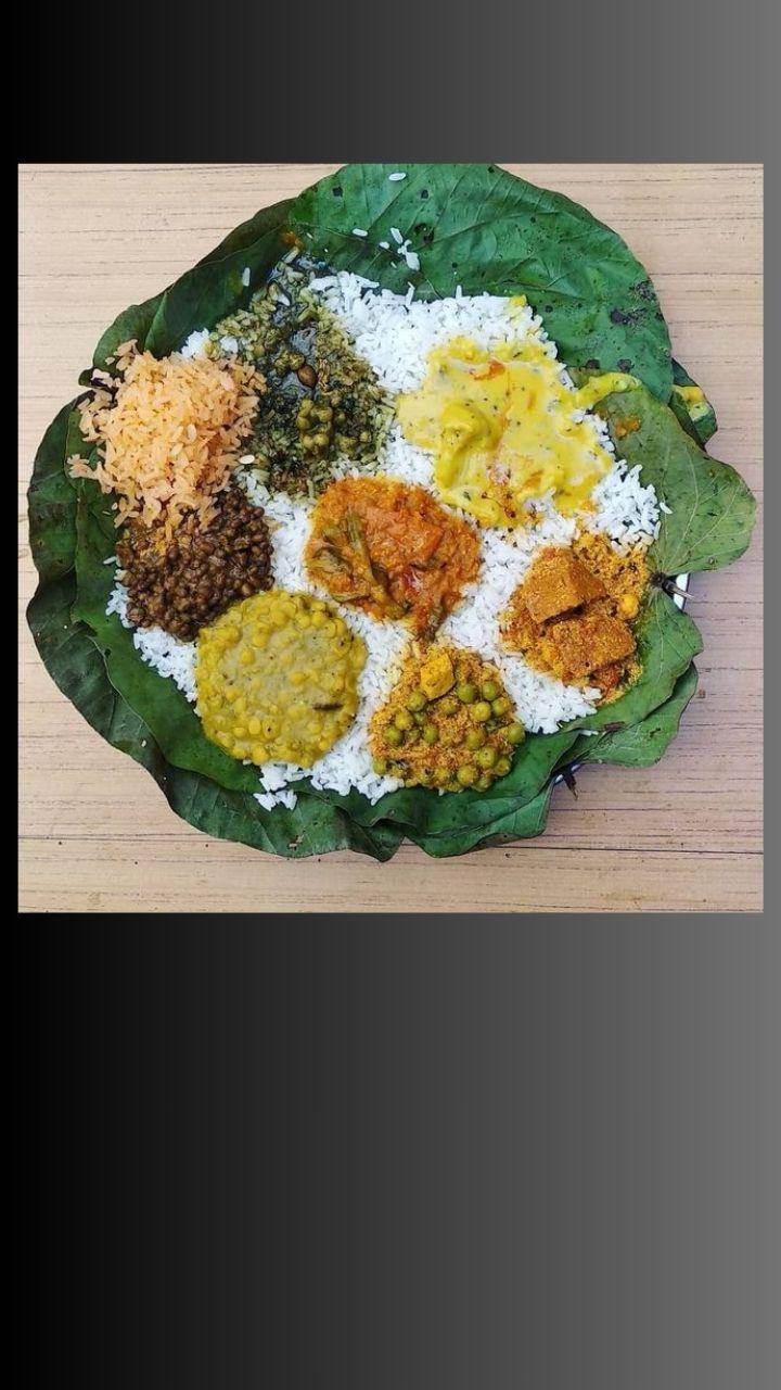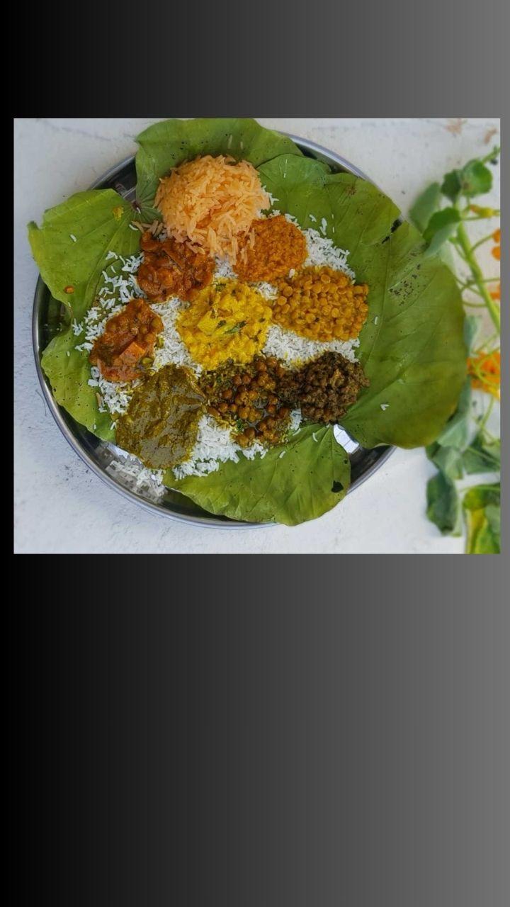 A traditional festive meal served on special occasions, consisting of rice, dal, rajma (kidney beans), curd, and sweet and sour dishes. Typically served on leaf plates.