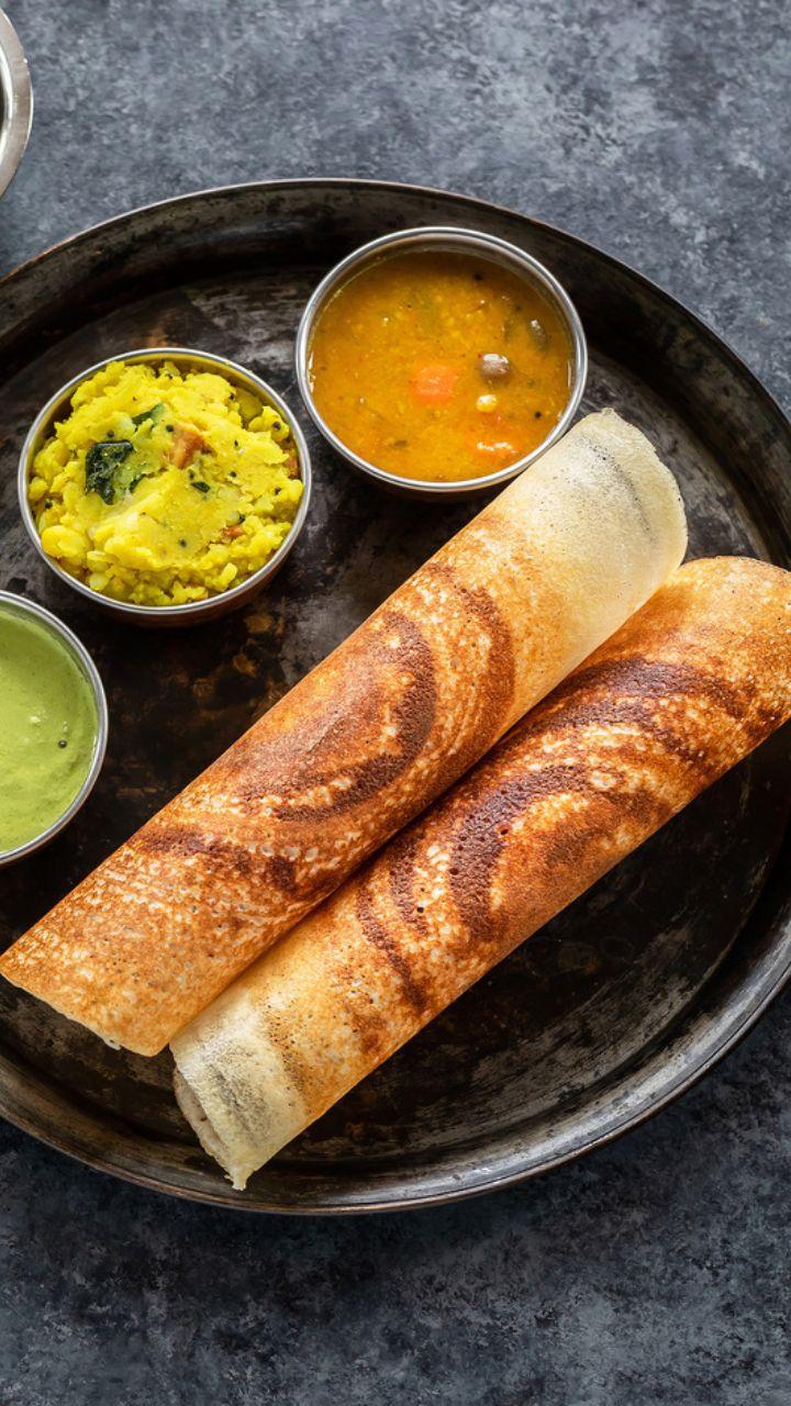 A thin, crispy pancake made from fermented rice and urad dal batter. It can be plain or stuffed with fillings like spiced potatoes (masala dosa).