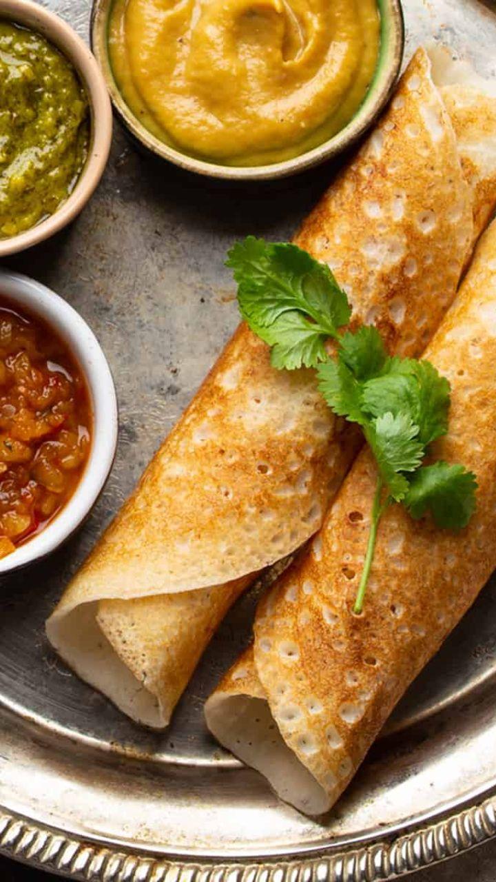 A type of dosa made with rice and green gram (moong dal) batter. It’s often served with upma and ginger chutney.