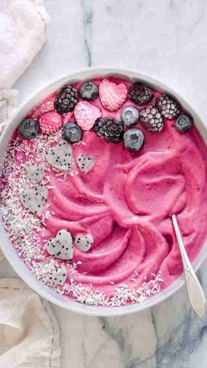 Smoothie Bowl: Blend frozen fruits like strawberries, mangoes, and bananas with Greek yogurt and a splash of milk. Pour the smoothie into a bowl and top with sliced kiwi, chia seeds, and chopped nuts