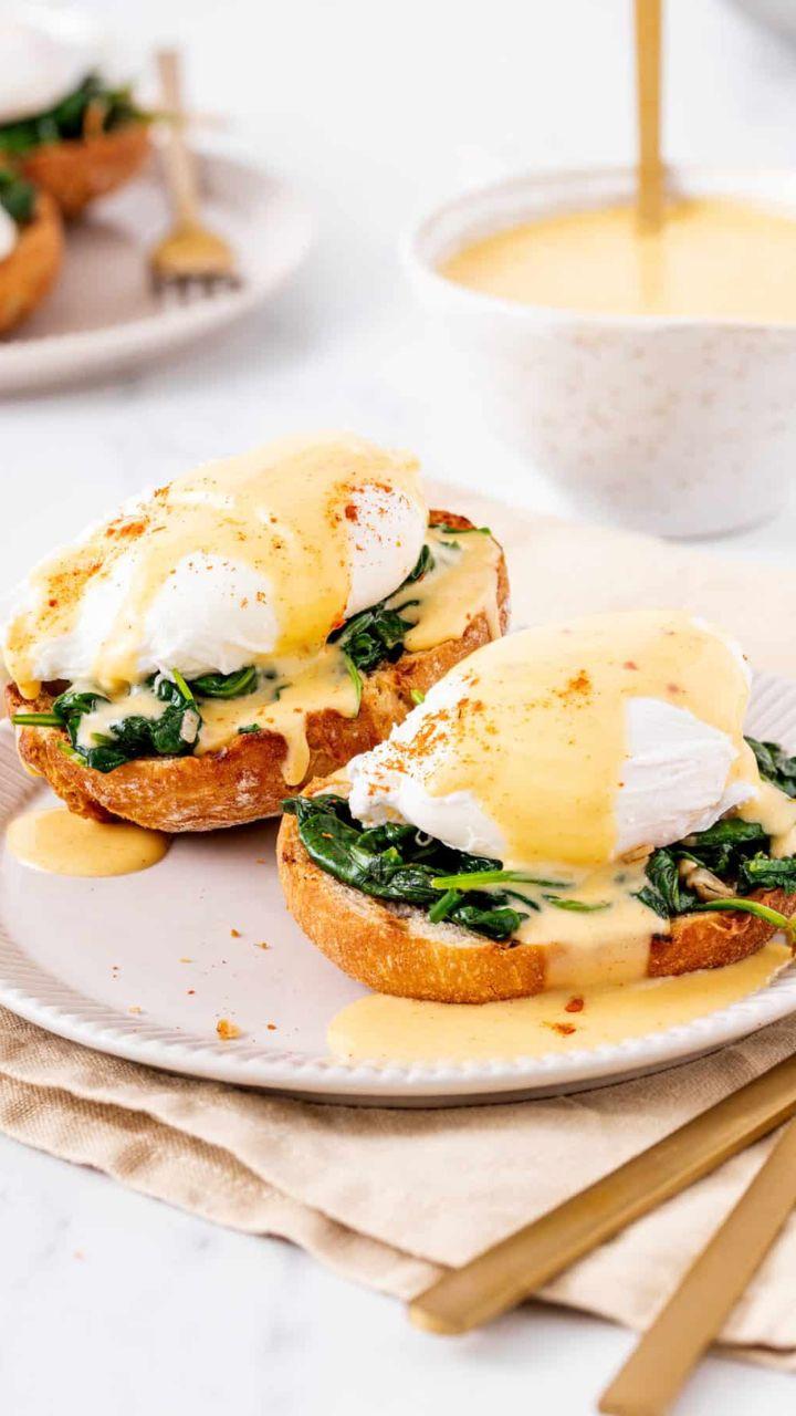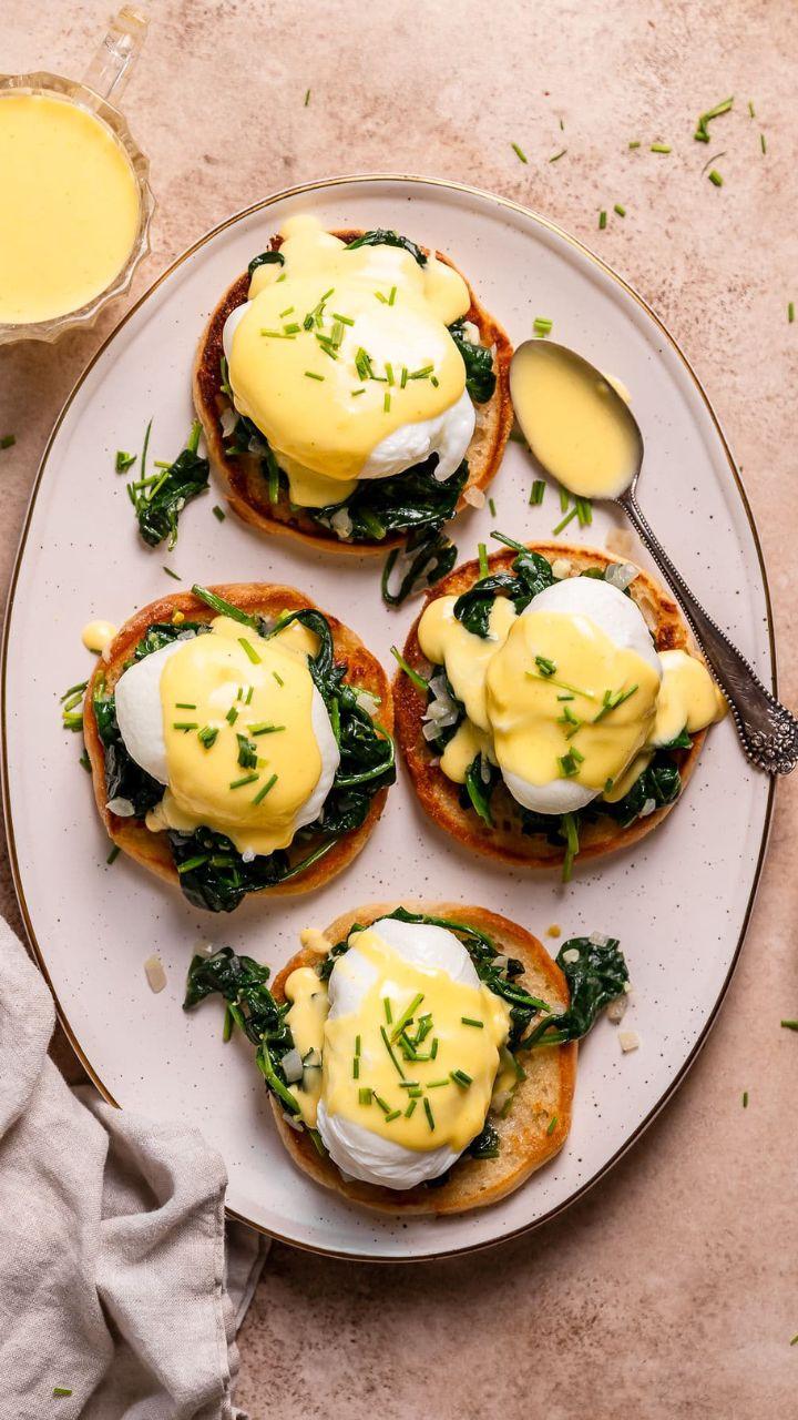 A variation of Eggs Benedict, where the Canadian bacon is replaced with sautéed spinach, and it's also topped with hollandaise sauce.