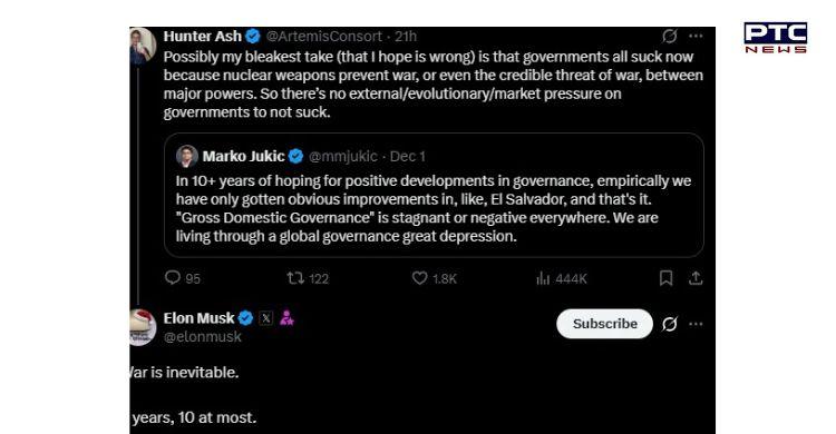 PTC Web Desk: Tech mogul Elon Musk has stirred widespread debate after warning that a major global conflict, potentially even a nuclear one, could erupt within the next five to 10 years. The remark came during an interaction on X (formerly Twitter), where a user claimed that modern governments have grown ineffective because nuclear weapons eliminate the threat of large-scale wars between powerful nations.